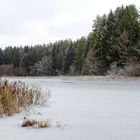 Озеро с тонким льдом и немного снега.