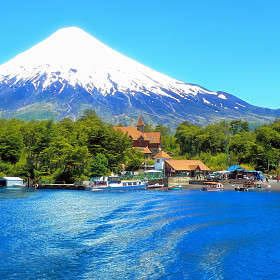 Вид на вулкан Озорно с озера Эмеральд, Чили