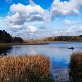 Рыбак на осеннем озере.